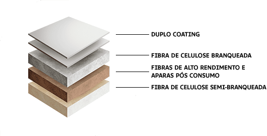 Cartão duplex com duplo revestimento, miolo de fibra de alto rendimento, 35% aparas pós-consumo e verso semi-branqueado.